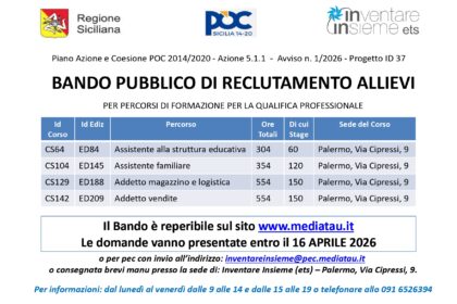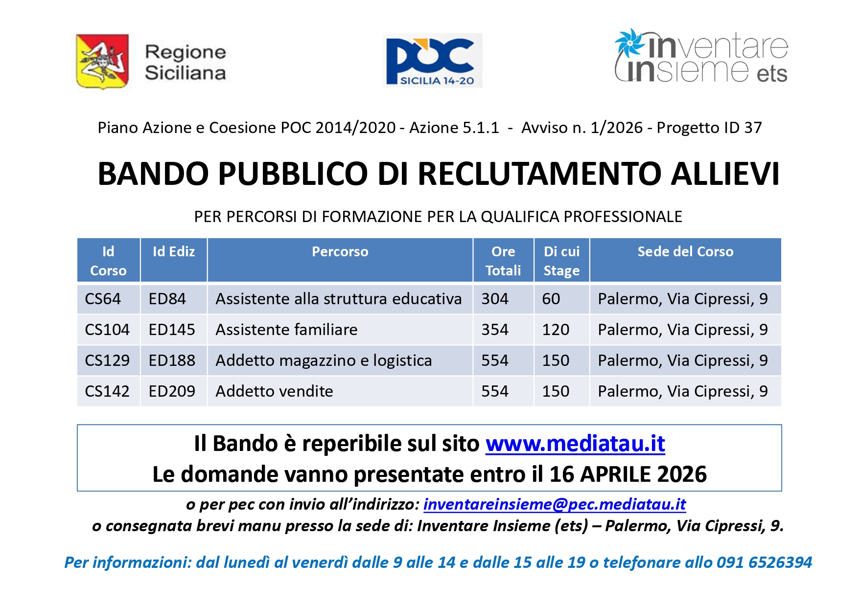 – o consegnata brevi manu presso la sede di: Inventare Insieme (ets) – Palermo, Via Cipressi, 9.